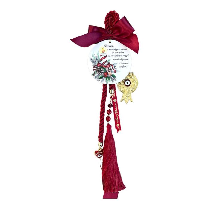 Ένα υπέροχο χειροποίητο γούρι με ξύλινο στοιχείο με ψηφιακή εκτύπωση χριστουγεννιάτικο κερί, με ευχές για το νέο έτος και μεταλλικό στοιχείο ρόδι με κόκκινο ματάκι για καλοτυχία με μπορντό κορδέλες.