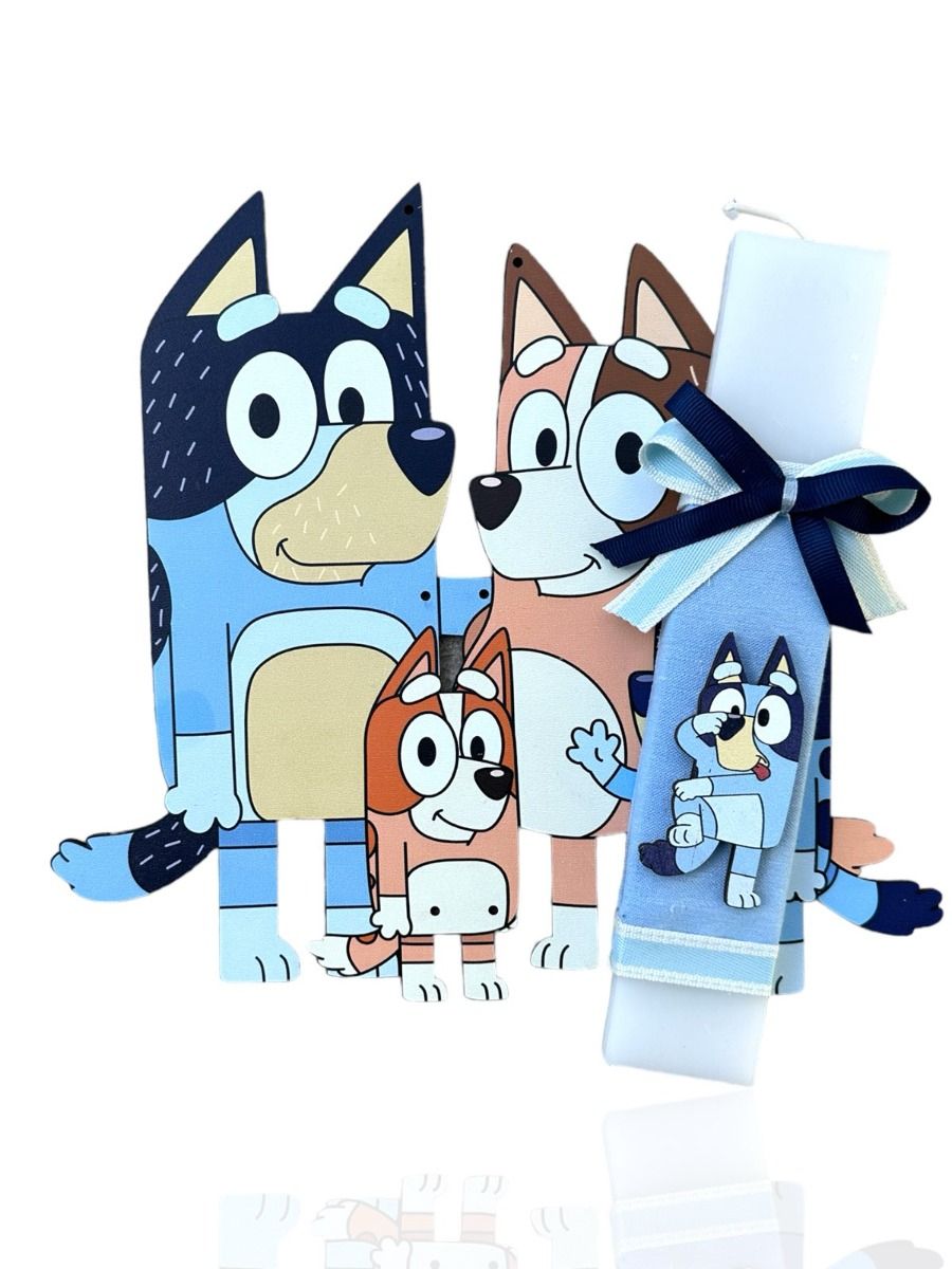 Πρωτότυπη χειροποίητη θεματική πασχαλινή λαμπάδα πλακέ “Bluey Family”, σε σετ με ξύλινη βάση που κρεμιέται ως διακοσμητικό καδράκι.