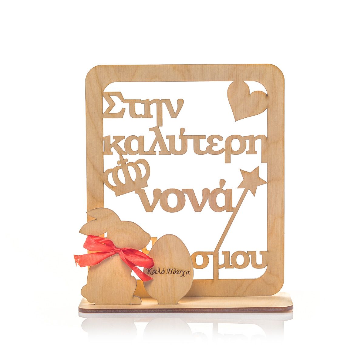 Υπέροχο ξύλινο χειροποίητο επιτραπέζιο διακοσμητικό σταντ για την καλύτερη νονά, με λαγουδάκι με κόκκινο φιοαγκάκι και δίπλα το πασχαλινό αυγο.